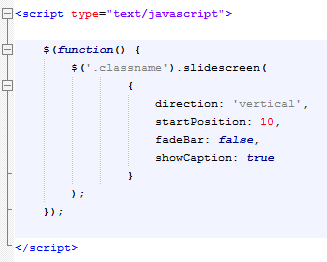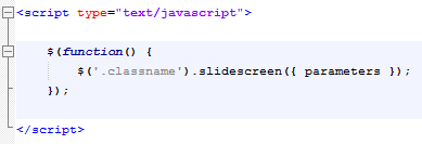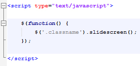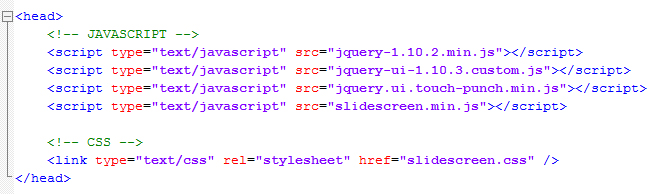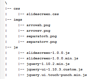 SlideScreen comes with one .js and one .css files, so these should be included in your html for you to use SlideScreen. Since this is a jQuery based plugin, you should include jQuery too. There are two other requisites for the plugin to work: you'll have to include jQuery UI and jQuery UI Touch Punch (to enable touch detection on mobile devices).
