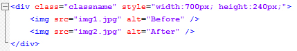 The plugin will take the first picture and make it the top layer picture in the slide screen. The second picture in structure will be on the bottom layer. If the "showCaption" option is set to true the text in the alt will be used. Ensure you're defining the width and height of the container where the images are.